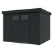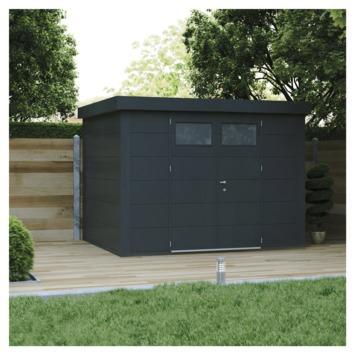 Het tuinhuis Eleganto van Aquaplan is een elegant metalen tuinhuis in de kleur antraciet. Het tuinhuis is verkrijgbaar in maar liefst 9 verschillende afmetingen, waaronder dit rechthoekige tuinhuis met aflopend dak van 3 op 2,7 meter groot. Het tuinhuis Eleganto beschikt over een dubbele deur met 2 ramen en is uitzonderlijk goed afgewerkt met onder andere een veilig cilinderslot en een geïntegreerde dakgoot. Het voordeel van een metalen tuinhuis? Makkelijk in elkaar te zetten (én uit elkaar te halen om elders weer in elkaar te zetten), ongelooflijk onderhoudsvriendelijk, stevig, duurzaam en mooi om te zien. Ook verkrijgbaar in de kleur wit.
