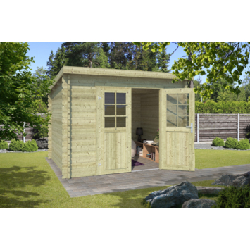 Met tuinhuis Fresia voeg je een praktische en compacte opbergoplossing toe aan je tuin. Dit model is gemaakt van geïmpregneerd vurenhout uit Noord-Europa en heeft een wanddikte van 28 mm. Het hout is onder druk behandeld, waardoor het beter bestand is tegen vocht, zonlicht, schimmels en insecten. De dubbele deuren met glas en afsluitbaar cilinderslot maken Fresia ideaal voor het veilig opbergen van tuinmeubilair, gereedschap of fietsen. Dankzij de stapelbouwmethode bouw je dit tuinhuis eenvoudig zelf op. De overkapping biedt beschutting tegen zon en regen, perfect voor een zitplek of extra opslagruimte.