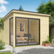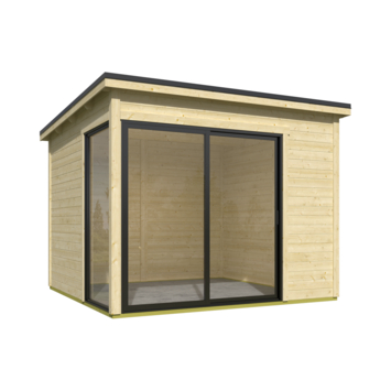 Dit modern vormgegeven tuinhuis Julia heeft een fundamentmaat van 295 cm(b) x 295 cm(d). De 28 mm dikke vurenhouten wanddelen zijn uitgevoerd met mes en groef. De stapelbouw methode in combinatie met hoekpalen en schroefsysteem zorgt voor een zeer sterke constructie. Dit mooie design tuinhuis wordt geleverd inclusief een aluminium schuifpui in de voorwand, waarvan beide panelen schuivend zijn en het linker paneel afsluitbaar is met een sleutel. In de linkerzijde wordt een vast aluminium glaspaneel gemonteerd. De aluminium delen zijn mat antracietgrijs van kleur en de panelen zijn voorzien van enkelglas. Dit tuinhuis is door de enorme lichtinval ook geschikt als tuinkamer, atelier of als tuinkantoor. U kunt dit tuinhuis ook in spiegelbeeld monteren. Het basispakket wordt geleverd inclusief montagehandleiding, onderdelenlijst en uiteraard alle benodigde bevestigingsmaterialen. Dit tuinhuis wordt zonder dakbedekking geleverd, hiervoor is optioneel een EPDM dakbedekking pakket bestelbaar. Dit stapelbare blokhut systeem is door een handige doe-het-zelver goed zelf te monteren, je moet wel even met z'n tweeën zijn. Dit tuinhuis wordt als bouwpakket bij u thuis geleverd.