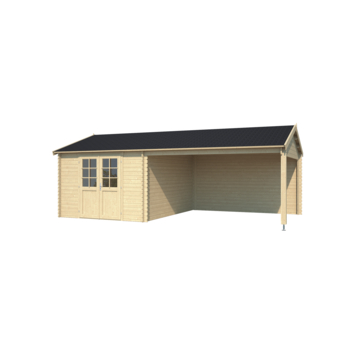 Deze blokhut is voorzien van een zadeldak. Dit zadeldak geeft door de hoogte van de nok een mooie en ruimtelijke beleving onder de overkapping. De hoge deuren met lage dorpel maken het gemakkelijk om spullen, zoals bijvoorbeeld een fiets, in het tuinhuis te plaatsen. De latten voor de 6-vlaks raamverdeling op de ruit in de deur worden los meegeleverd.