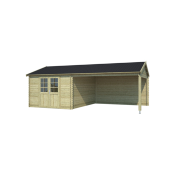 Deze blokhut is voorzien van een zadeldak. Dit zadeldak geeft door de hoogte van de nok een mooie en ruimtelijke beleving onder de overkapping. De hoge deuren met lage dorpel maken het gemakkelijk om spullen, zoals bijvoorbeeld een fiets, in het tuinhuis te plaatsen. De latten voor de 6-vlaks raamverdeling op de ruit in de deur worden los meegeleverd.