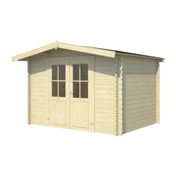Tuinhuis Mark 292x230 cm onbehandeld vuren is een praktische en royale blokhut met een traditionele uitstraling. Achter de afsluitbare dubbele deur met lage dorpel is bergruimte voor waardevolle spullen en/of tuingereedschap.
