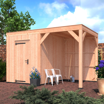 Dit modern vormgegeven tuinverblijf biedt een perfecte balans tussen uitstraling en functionaliteit. De totale afmetingen zijn 245 cm hoog, 395 cm breed en 255 cm diep. De berging heeft een breedte van 178,5 cm met een deur van 75 cm x 192,5 cm.De overkapping heeft een breedte van 178,5 cm en een doorloophoogte van 224 cm.Of je nu een gezellige loungehoek, een opslagruimte of een overdekte plek voor tuinfeestjes zoekt, dit Douglas tuinverblijf is een aanwinst voor iedere tuin.Natuurlijke uitstraling, degelijke kwaliteit.De wanden zijn bekleed met half houts rabat en de constructie is gemaakt van onbehandeld Douglas met stevige staanders van 12x12 cm.De keuze voor onbehandeld Douglas hout biedt een authentieke uitstraling en staat ook garant voor een lange levensduur.Functies:Door een overkapping mét opslag te kiezen, heb je een praktische ruimte om bijvoorbeeld tuingereedschap of fietsen op te slaan en af te sluiten, maar ook voor een ruimte om heerlijk beschut te ontspannen in uw eigen tuin. Het beste van 2 werelden!Klaar voor een groene toekomst:Dit modern vormgegeven tuinverblijf is speciaal ontworpen om zonnepanelen of een sedum dak te kunnen ondersteunen. Hierdoor is dit verblijf een duurzame en milieuvriendelijke aanvulling op uw tuin.Zelf aan de slagDankzij de duidelijke opbouwomschrijving, meegeleverde bevestigingsmaterialen en op maat gezaagde onderdelen, is de installatie van dit tuinhuis een haalbare klus voor iedere gemiddelde doe-het-zelver. Dakbekleding:Wij raden aan om deze Douglas overkapping te voorzien van een EPDM Dakbekleding voor een lekvrij dak (Let op: los bij te bestellen).Onderhoud:Bij het kopen van een overkapping is onderhoud een aandachtspunt… Met Douglas hout heb je het goed voor elkaar, Douglas is namelijk van zichzelf al een sterke houtsoort. Het gaat zonder extra behandeling eenvoudig 10 tot 15 jaar mee. Om de maximale levensduur te verlengen kun je gebruik maken van speciale Douglas beits of Douglas olie en elke 2 jaar opnieuw beitsen of oliën.