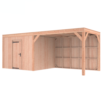 Dit modern vormgegeven tuinverblijf biedt een perfecte balans tussen uitstraling en functionaliteit. De totale afmetingen zijn 245 cm hoog, 645 cm breed en 255 cm diep. De berging heeft een breedte van 328,5 cm met een deur van 75 cm x 192,5 cm.De overkapping heeft een breedte van 278,5 cm en een doorloophoogte van 224 cm.Of je nu een gezellige loungehoek, een opslagruimte of een overdekte plek voor tuinfeestjes zoekt, dit Douglas tuinverblijf is een aanwinst voor iedere tuin.Natuurlijke uitstraling, degelijke kwaliteit.De wanden zijn bekleed met half houts rabat en de constructie is gemaakt van onbehandeld Douglas met stevige staanders van 12x12 cm.De keuze voor onbehandeld Douglas hout biedt een authentieke uitstraling en staat ook garant voor een lange levensduur.Functies:Door een overkapping mét opslag te kiezen, heb je een praktische ruimte om bijvoorbeeld tuingereedschap of fietsen op te slaan en af te sluiten, maar ook voor een ruimte om heerlijk beschut te ontspannen in uw eigen tuin. Het beste van 2 werelden!Klaar voor een groene toekomst:Dit modern vormgegeven tuinverblijf is speciaal ontworpen om zonnepanelen of een sedum dak te kunnen ondersteunen. Hierdoor is dit verblijf een duurzame en milieuvriendelijke aanvulling op uw tuin.Zelf aan de slagDankzij de duidelijke opbouwomschrijving, meegeleverde bevestigingsmaterialen en op maat gezaagde onderdelen, is de installatie van dit tuinhuis een haalbare klus voor iedere gemiddelde doe-het-zelver. Dakbekleding:Wij raden aan om deze Douglas overkapping te voorzien van een EPDM Dakbekleding voor een lekvrij dak (Let op: los bij te bestellen).Onderhoud:Bij het kopen van een overkapping is onderhoud een aandachtspunt… Met Douglas hout heb je het goed voor elkaar, Douglas is namelijk van zichzelf al een sterke houtsoort. Het gaat zonder extra behandeling eenvoudig 10 tot 15 jaar mee. Om de maximale levensduur te verlengen kun je gebruik maken van speciale Douglas beits of Douglas olie en elke 2 jaar opnieuw beitsen of oliën.