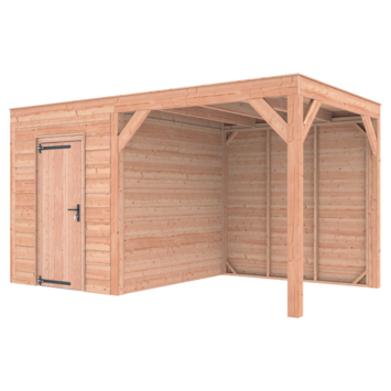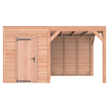 Dit modern vormgegeven tuinverblijf biedt een perfecte balans tussen uitstraling en functionaliteit. De totale afmetingen zijn 245 cm hoog, 445 cm breed en 255 cm diep. De berging heeft een breedte van 228,5 cm met een deur van 75 cm x 192,5 cm.De overkapping heeft een breedte van 178,5 cm en een doorloophoogte van 224 cm.Of je nu een gezellige loungehoek, een opslagruimte of een overdekte plek voor tuinfeestjes zoekt, dit Douglas tuinverblijf is een aanwinst voor iedere tuin.Natuurlijke uitstraling, degelijke kwaliteit.De wanden zijn bekleed met Douglas Zweeds rabat en de constructie is gemaakt van onbehandeld Douglas met stevige staanders van 12x12 cm.De keuze voor onbehandeld Douglas hout biedt een authentieke uitstraling en staat ook garant voor een lange levensduur.Functies:Door een overkapping mét opslag te kiezen, heb je een praktische ruimte om bijvoorbeeld tuingereedschap of fietsen op te slaan en af te sluiten, maar ook voor een ruimte om heerlijk beschut te ontspannen in uw eigen tuin. Het beste van 2 werelden!Klaar voor een groene toekomst:Dit modern vormgegeven tuinverblijf is speciaal ontworpen om zonnepanelen of een sedum dak te kunnen ondersteunen. Hierdoor is dit verblijf een duurzame en milieuvriendelijke aanvulling op uw tuin.Zelf aan de slagDankzij de duidelijke opbouwomschrijving, meegeleverde bevestigingsmaterialen en op maat gezaagde onderdelen, is de installatie van dit tuinhuis een haalbare klus voor iedere gemiddelde doe-het-zelver. Dakbekleding:Wij raden aan om deze Douglas overkapping te voorzien van een EPDM Dakbekleding voor een lekvrij dak (Let op: los bij te bestellen).Onderhoud:Bij het kopen van een overkapping is onderhoud een aandachtspunt… Met Douglas hout heb je het goed voor elkaar, Douglas is namelijk van zichzelf al een sterke houtsoort. Het gaat zonder extra behandeling eenvoudig 10 tot 15 jaar mee. Om de maximale levensduur te verlengen kun je gebruik maken van speciale Douglas beits of Douglas olie en elke 2 jaar opnieuw beitsen of oliën.