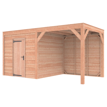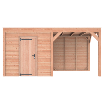 Dit modern vormgegeven tuinverblijf biedt een perfecte balans tussen uitstraling en functionaliteit. De totale afmetingen zijn 245 cm hoog, 495 cm breed en 255 cm diep. De berging heeft een breedte van 228,5 cm met een deur van 75 cm x 192,5 cm.De overkapping heeft een breedte van 228,5 cm en een doorloophoogte van 224 cm.Of je nu een gezellige loungehoek, een opslagruimte of een overdekte plek voor tuinfeestjes zoekt, dit Douglas tuinverblijf is een aanwinst voor iedere tuin.Natuurlijke uitstraling, degelijke kwaliteit.De wanden zijn bekleed met Douglas Zweeds rabat en de constructie is gemaakt van onbehandeld Douglas met stevige staanders van 12x12 cm.De keuze voor onbehandeld Douglas hout biedt een authentieke uitstraling en staat ook garant voor een lange levensduur.Functies:Door een overkapping mét opslag te kiezen, heb je een praktische ruimte om bijvoorbeeld tuingereedschap of fietsen op te slaan en af te sluiten, maar ook voor een ruimte om heerlijk beschut te ontspannen in uw eigen tuin. Het beste van 2 werelden!Klaar voor een groene toekomst:Dit modern vormgegeven tuinverblijf is speciaal ontworpen om zonnepanelen of een sedum dak te kunnen ondersteunen. Hierdoor is dit verblijf een duurzame en milieuvriendelijke aanvulling op uw tuin.Zelf aan de slagDankzij de duidelijke opbouwomschrijving, meegeleverde bevestigingsmaterialen en op maat gezaagde onderdelen, is de installatie van dit tuinhuis een haalbare klus voor iedere gemiddelde doe-het-zelver. Dakbekleding:Wij raden aan om deze Douglas overkapping te voorzien van een EPDM Dakbekleding voor een lekvrij dak (Let op: los bij te bestellen).Onderhoud:Bij het kopen van een overkapping is onderhoud een aandachtspunt… Met Douglas hout heb je het goed voor elkaar, Douglas is namelijk van zichzelf al een sterke houtsoort. Het gaat zonder extra behandeling eenvoudig 10 tot 15 jaar mee. Om de maximale levensduur te verlengen kun je gebruik maken van speciale Douglas beits of Douglas olie en elke 2 jaar opnieuw beitsen of oliën.