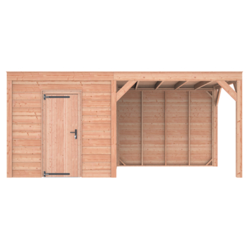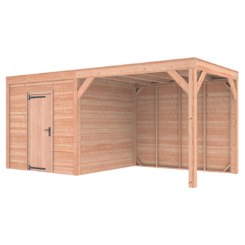 Dit modern vormgegeven tuinverblijf biedt een perfecte balans tussen uitstraling en functionaliteit. De totale afmetingen zijn 245 cm hoog, 545 cm breed en 255 cm diep. De berging heeft een breedte van 278,5 cm met een deur van 75 cm x 192,5 cm.De overkapping heeft een breedte van 228,5 cm en een doorloophoogte van 224 cm.Of je nu een gezellige loungehoek, een opslagruimte of een overdekte plek voor tuinfeestjes zoekt, dit Douglas tuinverblijf is een aanwinst voor iedere tuin.Natuurlijke uitstraling, degelijke kwaliteit.De wanden zijn bekleed met Douglas Zweeds rabat en de constructie is gemaakt van onbehandeld Douglas met stevige staanders van 12x12 cm.De keuze voor onbehandeld Douglas hout biedt een authentieke uitstraling en staat ook garant voor een lange levensduur.Functies:Door een overkapping mét opslag te kiezen, heb je een praktische ruimte om bijvoorbeeld tuingereedschap of fietsen op te slaan en af te sluiten, maar ook voor een ruimte om heerlijk beschut te ontspannen in uw eigen tuin. Het beste van 2 werelden!Klaar voor een groene toekomst:Dit modern vormgegeven tuinverblijf is speciaal ontworpen om zonnepanelen of een sedum dak te kunnen ondersteunen. Hierdoor is dit verblijf een duurzame en milieuvriendelijke aanvulling op uw tuin.Zelf aan de slagDankzij de duidelijke opbouwomschrijving, meegeleverde bevestigingsmaterialen en op maat gezaagde onderdelen, is de installatie van dit tuinhuis een haalbare klus voor iedere gemiddelde doe-het-zelver. Dakbekleding:Wij raden aan om deze Douglas overkapping te voorzien van een EPDM Dakbekleding voor een lekvrij dak (Let op: los bij te bestellen).Onderhoud:Bij het kopen van een overkapping is onderhoud een aandachtspunt… Met Douglas hout heb je het goed voor elkaar, Douglas is namelijk van zichzelf al een sterke houtsoort. Het gaat zonder extra behandeling eenvoudig 10 tot 15 jaar mee. Om de maximale levensduur te verlengen kun je gebruik maken van speciale Douglas beits of Douglas olie en elke 2 jaar opnieuw beitsen of oliën.