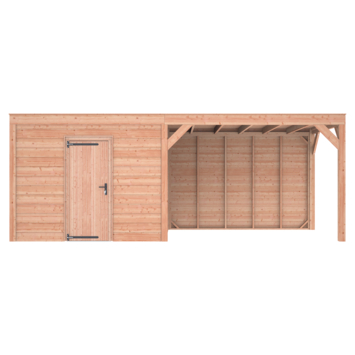 Dit modern vormgegeven tuinverblijf biedt een perfecte balans tussen uitstraling en functionaliteit. De totale afmetingen zijn 245 cm hoog, 645 cm breed en 255 cm diep. De berging heeft een breedte van 328,5 cm met een deur van 75 cm x 192,5 cm.De overkapping heeft een breedte van 278,5 cm en een doorloophoogte van 224 cm.Of je nu een gezellige loungehoek, een opslagruimte of een overdekte plek voor tuinfeestjes zoekt, dit Douglas tuinverblijf is een aanwinst voor iedere tuin.Natuurlijke uitstraling, degelijke kwaliteit.De wanden zijn bekleed met Douglas Zweeds rabat en de constructie is gemaakt van onbehandeld Douglas met stevige staanders van 12x12 cm.De keuze voor onbehandeld Douglas hout biedt een authentieke uitstraling en staat ook garant voor een lange levensduur.Functies:Door een overkapping mét opslag te kiezen, heb je een praktische ruimte om bijvoorbeeld tuingereedschap of fietsen op te slaan en af te sluiten, maar ook voor een ruimte om heerlijk beschut te ontspannen in uw eigen tuin. Het beste van 2 werelden!Klaar voor een groene toekomst:Dit modern vormgegeven tuinverblijf is speciaal ontworpen om zonnepanelen of een sedum dak te kunnen ondersteunen. Hierdoor is dit verblijf een duurzame en milieuvriendelijke aanvulling op uw tuin.Zelf aan de slagDankzij de duidelijke opbouwomschrijving, meegeleverde bevestigingsmaterialen en op maat gezaagde onderdelen, is de installatie van dit tuinhuis een haalbare klus voor iedere gemiddelde doe-het-zelver. Dakbekleding:Wij raden aan om deze Douglas overkapping te voorzien van een EPDM Dakbekleding voor een lekvrij dak (Let op: los bij te bestellen).Onderhoud:Bij het kopen van een overkapping is onderhoud een aandachtspunt… Met Douglas hout heb je het goed voor elkaar, Douglas is namelijk van zichzelf al een sterke houtsoort. Het gaat zonder extra behandeling eenvoudig 10 tot 15 jaar mee. Om de maximale levensduur te verlengen kun je gebruik maken van speciale Douglas beits of Douglas olie en elke 2 jaar opnieuw beitsen of oliën.