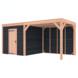 Dit modern vormgegeven tuinverblijf biedt een perfecte balans tussen uitstraling en functionaliteit. De totale afmetingen zijn 245 cm hoog, 545 cm breed en 255 cm diep. De berging heeft een breedte van 278,5 cm met een deur van 75 cm x 192,5 cm.De overkapping heeft een breedte van 228,5 cm en een doorloophoogte van 224 cm.Of je nu een gezellige loungehoek, een opslagruimte of een overdekte plek voor tuinfeestjes zoekt, dit Douglas tuinverblijf is een aanwinst voor iedere tuin.Natuurlijke uitstraling, degelijke kwaliteit.De wanden zijn bekleed met zwart Zweeds rabat en de constructie is gemaakt van onbehandeld Douglas met stevige staanders van 12x12 cm.De keuze voor onbehandeld Douglas hout biedt een authentieke uitstraling en staat ook garant voor een lange levensduur.Functies:Door een overkapping mét opslag te kiezen, heb je een praktische ruimte om bijvoorbeeld tuingereedschap of fietsen op te slaan en af te sluiten, maar ook voor een ruimte om heerlijk beschut te ontspannen in uw eigen tuin. Het beste van 2 werelden!Klaar voor een groene toekomst:Dit modern vormgegeven tuinverblijf is speciaal ontworpen om zonnepanelen of een sedum dak te kunnen ondersteunen. Hierdoor is dit verblijf een duurzame en milieuvriendelijke aanvulling op uw tuin.Zelf aan de slagDankzij de duidelijke opbouwomschrijving, meegeleverde bevestigingsmaterialen en op maat gezaagde onderdelen, is de installatie van dit tuinhuis een haalbare klus voor iedere gemiddelde doe-het-zelver. Dakbekleding:Wij raden aan om deze Douglas overkapping te voorzien van een EPDM Dakbekleding voor een lekvrij dak (Let op: los bij te bestellen).Onderhoud:Bij het kopen van een overkapping is onderhoud een aandachtspunt… Met Douglas hout heb je het goed voor elkaar, Douglas is namelijk van zichzelf al een sterke houtsoort. Het gaat zonder extra behandeling eenvoudig 10 tot 15 jaar mee. Om de maximale levensduur te verlengen kun je gebruik maken van speciale Douglas beits of Douglas olie en elke 2 jaar opnieuw beitsen of oliën.