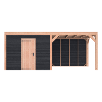 Dit modern vormgegeven tuinverblijf biedt een perfecte balans tussen uitstraling en functionaliteit. De totale afmetingen zijn 245 cm hoog, 595 cm breed en 255 cm diep. De berging heeft een breedte van 278,5 cm met een deur van 75 cm x 192,5 cm.De overkapping heeft een breedte van 278,5 cm en een doorloophoogte van 224 cm.Of je nu een gezellige loungehoek, een opslagruimte of een overdekte plek voor tuinfeestjes zoekt, dit Douglas tuinverblijf is een aanwinst voor iedere tuin.Natuurlijke uitstraling, degelijke kwaliteit.De wanden zijn bekleed met zwart Zweeds rabat en de constructie is gemaakt van onbehandeld Douglas met stevige staanders van 12x12 cm.De keuze voor onbehandeld Douglas hout biedt een authentieke uitstraling en staat ook garant voor een lange levensduur.Functies:Door een overkapping mét opslag te kiezen, heb je een praktische ruimte om bijvoorbeeld tuingereedschap of fietsen op te slaan en af te sluiten, maar ook voor een ruimte om heerlijk beschut te ontspannen in uw eigen tuin. Het beste van 2 werelden!Klaar voor een groene toekomst:Dit modern vormgegeven tuinverblijf is speciaal ontworpen om zonnepanelen of een sedum dak te kunnen ondersteunen. Hierdoor is dit verblijf een duurzame en milieuvriendelijke aanvulling op uw tuin.Zelf aan de slagDankzij de duidelijke opbouwomschrijving, meegeleverde bevestigingsmaterialen en op maat gezaagde onderdelen, is de installatie van dit tuinhuis een haalbare klus voor iedere gemiddelde doe-het-zelver. Dakbekleding:Wij raden aan om deze Douglas overkapping te voorzien van een EPDM Dakbekleding voor een lekvrij dak (Let op: los bij te bestellen).Onderhoud:Bij het kopen van een overkapping is onderhoud een aandachtspunt… Met Douglas hout heb je het goed voor elkaar, Douglas is namelijk van zichzelf al een sterke houtsoort. Het gaat zonder extra behandeling eenvoudig 10 tot 15 jaar mee. Om de maximale levensduur te verlengen kun je gebruik maken van speciale Douglas beits of Douglas olie en elke 2 jaar opnieuw beitsen of oliën.
