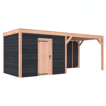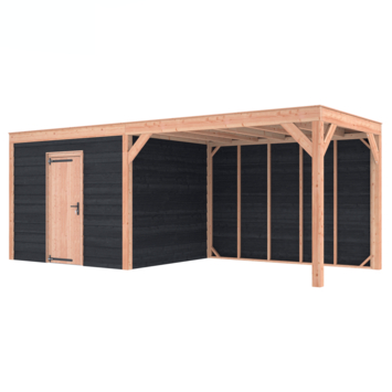 Dit modern vormgegeven tuinverblijf biedt een perfecte balans tussen uitstraling en functionaliteit. De totale afmetingen zijn 245 cm hoog, 645 cm breed en 255 cm diep. De berging heeft een breedte van 328,5 cm met een deur van 75 cm x 192,5 cm.De overkapping heeft een breedte van 278,5 cm en een doorloophoogte van 224 cm.Of je nu een gezellige loungehoek, een opslagruimte of een overdekte plek voor tuinfeestjes zoekt, dit Douglas tuinverblijf is een aanwinst voor iedere tuin.Natuurlijke uitstraling, degelijke kwaliteit.De wanden zijn bekleed met zwart Zweeds rabat en de constructie is gemaakt van onbehandeld Douglas met stevige staanders van 12x12 cm.De keuze voor onbehandeld Douglas hout biedt een authentieke uitstraling en staat ook garant voor een lange levensduur.Functies:Door een overkapping mét opslag te kiezen, heb je een praktische ruimte om bijvoorbeeld tuingereedschap of fietsen op te slaan en af te sluiten, maar ook voor een ruimte om heerlijk beschut te ontspannen in uw eigen tuin. Het beste van 2 werelden!Klaar voor een groene toekomst:Dit modern vormgegeven tuinverblijf is speciaal ontworpen om zonnepanelen of een sedum dak te kunnen ondersteunen. Hierdoor is dit verblijf een duurzame en milieuvriendelijke aanvulling op uw tuin.Zelf aan de slagDankzij de duidelijke opbouwomschrijving, meegeleverde bevestigingsmaterialen en op maat gezaagde onderdelen, is de installatie van dit tuinhuis een haalbare klus voor iedere gemiddelde doe-het-zelver. Dakbekleding:Wij raden aan om deze Douglas overkapping te voorzien van een EPDM Dakbekleding voor een lekvrij dak (Let op: los bij te bestellen).Onderhoud:Bij het kopen van een overkapping is onderhoud een aandachtspunt… Met Douglas hout heb je het goed voor elkaar, Douglas is namelijk van zichzelf al een sterke houtsoort. Het gaat zonder extra behandeling eenvoudig 10 tot 15 jaar mee. Om de maximale levensduur te verlengen kun je gebruik maken van speciale Douglas beits of Douglas olie en elke 2 jaar opnieuw beitsen of oliën.