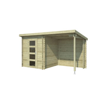 De blokhut is opgebouwd met massieve wandbalken van 28 mm dik en gebruikt een stapelbouwwijze, zodat je de wanden stap voor stap opbouwt. Het dak is een schuin dak met de afwatering aan de achterzijde. Het overkapte deel kan bij dit type uitvoering gespiegeld worden opgebouwd. Alle aangegeven maatvoeringen zijn circa maten.