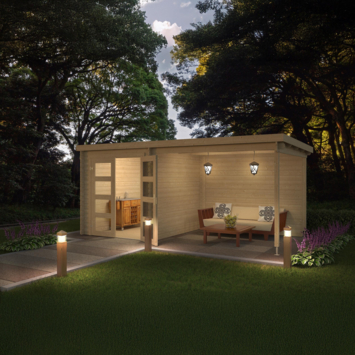 Het tuinhuis is uitgevoerd in geschaafd vurenhout en wordt onbehandeld geleverd. De dubbele glazen deuren laten veel daglicht binnen en zijn afsluitbaar met een cilinderslot. Het dak loopt schuin af en voert regenwater af aan de achterzijde. Door de stapelbouwconstructie is de montage goed te doen voor de gemiddelde klusser.
