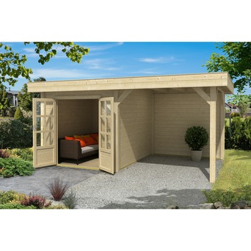 Een tuinhuis geeft meer sfeer aan je tuin, zoals deze vrijstaande overkapping Java 304x396 cm incl. tuinhuisje en achterwand. Dit tuinhuis met een oppervlakte van 15 m² heeft zowel een open als een afgesloten gedeelte. Het open deel is een uitstekende plek om je houtblokken in op te slaan, het dichte gedeelte kan je gebruiken als een tweede huiskamer. Dit tuinhuis is gemaakt van Noord-Europees vurenhout, afkomstig van de fijnspar, een houtsoort die bekendstaat om zijn relatief lage prijs en makkelijke bewerking: veel gemak voor weinig geld. De dubbele deuren zijn voorzien van ramen, zodat er licht naar binnen valt. Ook heeft het tuinhuis een cilinderslot, zodat je hem kunt afsluiten. De dakbedekking van het platte dak bestaat uit EPDM-rubberfolie: een degelijk en waterdicht materiaal dat ongeveer 50 jaar meegaat.