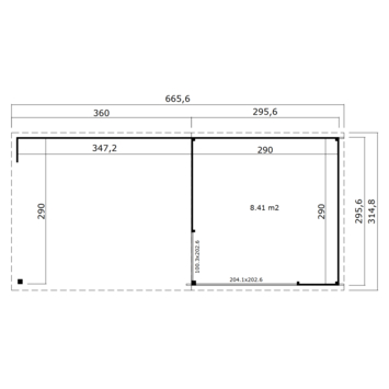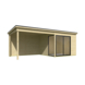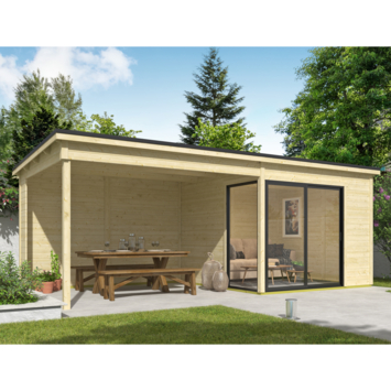 Dit modern vormgegeven tuinhuis Julia heeft een fundamentmaat van 646cm(b) x 295cm(d). De overkapping is 350cm breed. De 28mm dikke vurenhouten wanddelen zijn uitgevoerd met mes en groef. De stapelbouw methode in combinatie met hoekpalen en schroefsysteem zorgt voor een zeer sterke constructie. Dit mooie design tuinhuis wordt geleverd inclusief een aluminium schuifpui in de voorwand waarvan beide panelen schuivend zijn en het linker paneel afsluitbaar is met een sleutel. In de linkerzijde wordt een vast aluminium glaspaneel gemonteerd. De aluminium delen zijn mat antracietgrijs van kleur en de panelen zijn voorzien van enkelglas. Dit tuinhuis is door de enorme lichtinval ook geschikt als tuinkamer, atelier of als tuinkantoor. Onder de overkapping is het heerlijk beschut vertoeven. Je kan dit tuinhuis ook in spiegelbeeld monteren. Het basispakket wordt geleverd inclusief montagehandleiding, onderdelenlijst en uiteraard alle benodigde bevestigingsmaterialen. Voor langdurig plezier van je tuinhuis, wordt aangeraden een EDPM dakbedekkingpakket aan te kopen om waterdichtheid te verzekeren. Dit stapelbouwbouw systeem is door een handige doe-het-zelver goed zelf te monteren, je moet wel even met z'n tweeën zijn. Dit tuinhuis wordt als bouwpakket bij je thuis geleverd.