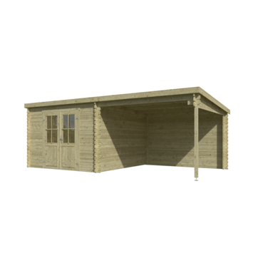 Deze blokhut met overkapping is voorzien van een schuin aflopend dak met de afwatering aan de achterzijde. Dit type blokhut met overkapping kan gespiegeld worden opgebouwd. In dat geval wordt het overkapte deel aan de linkerkant geplaatst en het dichte gedeelte rechts. De latten voor de 4-vlaks raamverdeling op de ruit in de deur worden los meegeleverd.