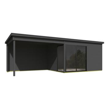 Dit modern vormgegeven tuinhuis Olivia heeft een fundamentmaat van 735cm(b) x 295cm(d). De overkapping is 350cm breed. De 28mm dikke vurenhouten wanddelen zijn uitgevoerd met mes en groef. De stapelbouw methode in combinatie met hoekpalen en schroefsysteem zorgt voor een zeer sterke constructie. Dit mooie design tuinhuis wordt geleverd inclusief een aluminium schuifpui in de voorwand waarvan beide panelen schuivend zijn en het linker paneel afsluitbaar is met een sleutel. In de linkerzijde wordt een vast aluminium glaspaneel gemonteerd. De aluminium delen zijn mat antracietgrijs van kleur en de panelen zijn voorzien van enkelglas. Dit tuinhuis is door de enorme lichtinval ook geschikt als tuinkamer, atelier of als tuinkantoor. Onder de overkapping is het heerlijk beschut vertoeven. Je kan dit tuinhuis ook in spiegelbeeld monteren. Het basispakket wordt geleverd inclusief montagehandleiding, onderdelenlijst en uiteraard alle benodigde bevestigingsmaterialen. Voor langdurig plezier van je tuinhuis, wordt aangeraden een EDPM dakbedekkingpakket aan te kopen om waterdichtheid te verzekeren. Dit stapelbouwbouw systeem is door een handige doe-het-zelver goed zelf te monteren, je moet wel even met z'n tweeën zijn. Dit tuinhuis wordt als bouwpakket bij je thuis geleverd.