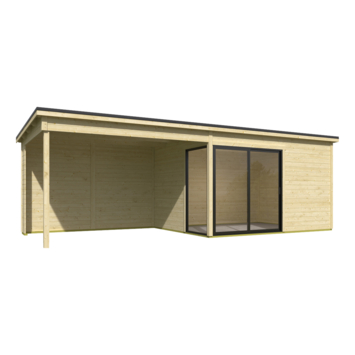 Dit modern vormgegeven tuinhuis Olivia heeft een fundamentmaat van 735cm(b) x 295cm(d). De overkapping is 350cm breed. De 28mm dikke vurenhouten wanddelen zijn uitgevoerd met mes en groef. De stapelbouw methode in combinatie met hoekpalen en schroefsysteem zorgt voor een zeer sterke constructie. Dit mooie design tuinhuis wordt geleverd inclusief een aluminium schuifpui in de voorwand waarvan beide panelen schuivend zijn en het linker paneel afsluitbaar is met een sleutel. In de linkerzijde wordt een vast aluminium glaspaneel gemonteerd. De aluminium delen zijn mat antracietgrijs van kleur en de panelen zijn voorzien van enkelglas. Dit tuinhuis is door de enorme lichtinval ook geschikt als tuinkamer, atelier of als tuinkantoor. Onder de overkapping is het heerlijk beschut vertoeven. Je kan dit tuinhuis ook in spiegelbeeld monteren. Het basispakket wordt geleverd inclusief montagehandleiding, onderdelenlijst en uiteraard alle benodigde bevestigingsmaterialen. Voor langdurig plezier van je tuinhuis, wordt aangeraden een EDPM dakbedekkingpakket aan te kopen om waterdichtheid te verzekeren. Dit stapelbouwbouw systeem is door een handige doe-het-zelver goed zelf te monteren, je moet wel even met z'n tweeën zijn. Dit tuinhuis wordt als bouwpakket bij je thuis geleverd.