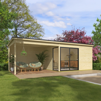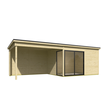 Tuinhuis met overkapping Olivia vurenhout onbehandeld 735 x 295 cm is een modern houten tuinhuis met een ruime overkapping. Je gebruikt het als tuinkamer, atelier of werkruimte, terwijl je onder de overkapping beschut buiten kunt zitten. Het tuinhuis is opgebouwd uit 28 mm dikke vurenhouten wanddelen met mes-en-groef.