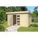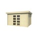 Dit tuinhuis is gemaakt van onbehandeld vurenhout met een wanddikte van 28 mm. De wanden bouw je op met de stapelbouwmethode, waarbij planken met tand- en groefprofielen laag voor laag op elkaar worden geplaatst zonder steunpilaren. Dit zorgt voor een stevige constructie en een strak uiterlijk. Het dak is plat uitgevoerd met een lichte helling en een kleine overstek, zodat regenwater op natuurlijke wijze wordt afgevoerd.