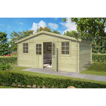 Tuinhuis Stinna is een praktische en een zeer royale blokhut met een traditionele look. Achter de afsluitbare dubbele deur met lage dorpel is bergruimte voor waardevolle spullen en/of tuingereedschap.