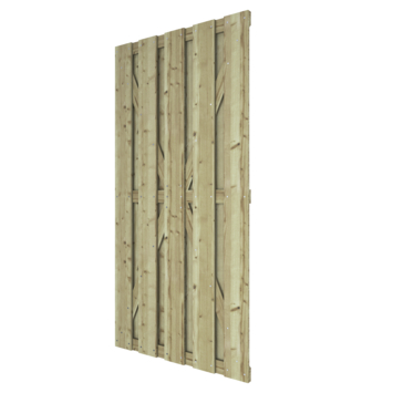 Deze poort past perfect bij de schutting uit dezelfde serie: Jumbo. Hiermee maak je jouw tuinafscherming helemaal af! Het is wel te adviseren het hout na 5 jaar te behandelen met een tuinbeits. De tuindeur bestaat uit 9 planken van ca. 13,5 cm breed en ca. 1,3 cm dik. De planken zijn bevestigd door middel van schroeven. De poort heeft, net zoals de schutting, een levensduur van ongeveer 10 jaar en gemiddelde privacy. De poort heeft een standaard breedte van ca. 90 cm en een hoogte van ca. 180 cm. Deze tuindeur kan zowel links- als rechtsdraaiend worden geplaatst. Bevestigingsmateriaal dient los te worden aangeschaft.