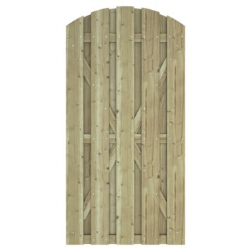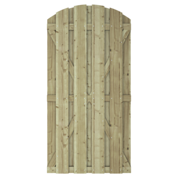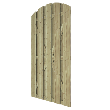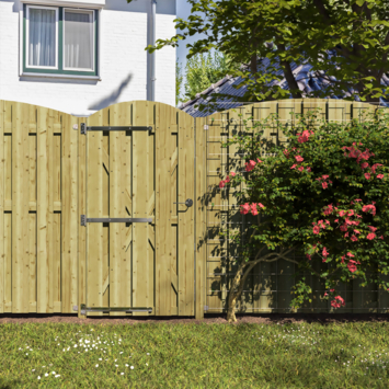 Deze poort past perfect bij de schutting uit dezelfde serie: Jumbo. Hiermee maak je jouw tuinafscherming helemaal af! Het is wel te adviseren het hout na 5 jaar te behandelen met een tuinbeits. De tuindeur bestaat uit 9 planken van ca. 13,5 cm breed en ca. 1,3 cm dik. De planken zijn bevestigd door middel van schroeven. De poort heeft, net zoals de schutting, een levensduur van ongeveer 10 jaar en gemiddelde privacy. De poort heeft een standaard breedte van ca. 90 cm en een hoogte van ca. 180 cm. Deze tuindeur kan zowel links- als rechtsdraaiend worden geplaatst. Bevestigingsmateriaal dient los te worden aangeschaft.