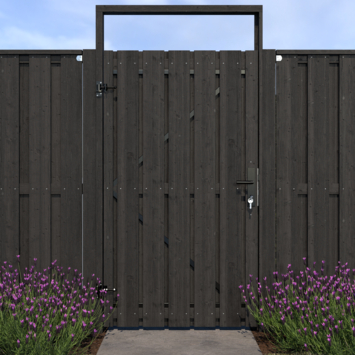 De tuindeur recht grenen geschaafd geïmpregneerd en gedompeld antraciet op zwart stalen frame is 180 cm hoog, 100 cm breed, 5,5 cm diep en heeft weinig doorkijk. De tuindeur bestaat uit 13 verticale planken die met RVS schroeven op een zwart stalen frame zijn vastgemaakt. De tuindeur is tweezijdig, kan zowel links- als rechtsdraaiend gemonteerd worden en wordt inclusief hengen geleverd.