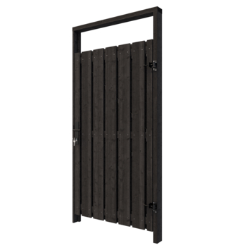 De tuindeur is gemaakt de houtsoort grenen. Grenen is een naaldhoutsoort die van nature zachter en vetter is dan vuren. Deze harsrijke soort is één van de meest gebruikte houtsoorten in Europa. Om de levensduur te verlengen wordt deze houtsoort vacuümdruk geïmpregneerd met Tanalith E. Deze methode zorgt ervoor dat de levensduur verlengd wordt tot 5-10 jaar en dat het hout resistent wordt tegen (oppervlakte) schimmels. Na het impregneren is de deur zwart gedompeld.