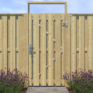 De tuindeur is gemaakt de houtsoort grenen. Grenen is een naaldhoutsoort die van nature zachter en vetter is dan vuren. Deze harsrijke soort is één van de meest gebruikte houtsoorten in Europa. Om de levensduur te verlengen wordt deze houtsoort vacuümdruk geïmpregneerd met Tanalith E. Deze methode zorgt ervoor dat de levensduur verlengd wordt tot 10-15 jaar en dat het hout resistent wordt tegen (oppervlakte) schimmels.