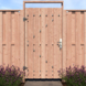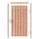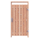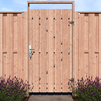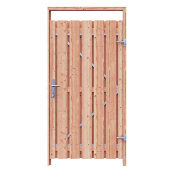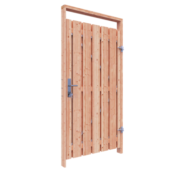 De tuindeur recht Douglas geschaafd op metalen frame is 190 cm hoog, 100 cm breed en 5,2 cm diep en heeft weinig doorkijk. De tuindeur bestaat uit 13 verticale planken met RVS schroeven op een stalen frame zijn vastgemaakt. De tuindeur is tweezijdig, kan zowel links- als rechtsdraaiend gemonteerd worden en wordt inclusief hengen geleverd.