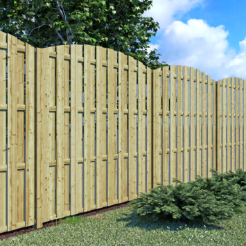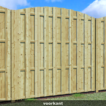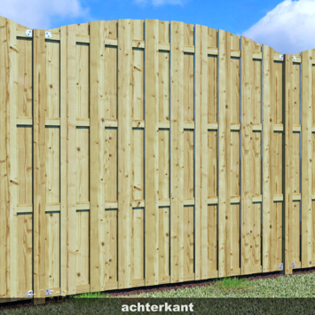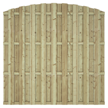 Dit tuinscherm is gemaakt van geïmpregneerd ruw grenenhout. Aan de bovenzijde heeft de schutting een ronding of een toog. Het tuinscherm bestaat uit 19 planken van 9,8 centimeter breed en 0,7 centimeter dik. De planken zijn bevestigd door middel van nietjes. De schutting is 1 meter 80 hoog en 1 meter 80 breed. In vergelijking met andere schuttingen die bij GAMMA verkrijgbaar zijn heeft deze schutting minimale privacy. Dit heeft vooral te maken met de plankmaat, het aantal planken en de afstand tussen de planken. Doordat deze geïmpregneerd is, is het hout beter beschermd tegen weersomstandigheden. Onderhoud hoeft voor deze schutting pas na 5 jaar te worden gepleegd. Behandel de schutting dan met een tuinbeits.
