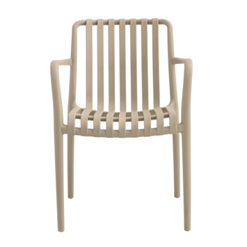 Deze stoel is vervaardigd uit stevig, beige kunststof, wat de tuinstoel zowel eenvoudig te onderhouden als weerbestendig maakt. Dankzij het stapelbare ontwerp kun je de stoelen moeiteloos opbergen wanneer ze niet in gebruik zijn.
