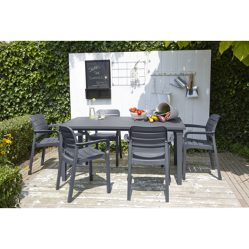 Met de tuinstoel Romy haal je een moderne en functionele stoel in huis die perfect is voor elke tuin of terras. De zwarte kleur en het strakke design geven de stoel een tijdloze uitstraling, waardoor hij eenvoudig te combineren is met andere tuinmeubelen. Deze stoel biedt een comfortabele zitervaring, terwijl het stevige kunststof materiaal zorgt voor een lange levensduur en minimale onderhoudsbehoefte.