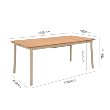 - Tafelblad 181,5 cm (uitschuifbaar tot 238,5 cm) x 90 cm, hoogte 75,3 cm