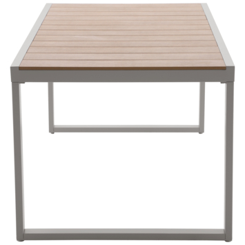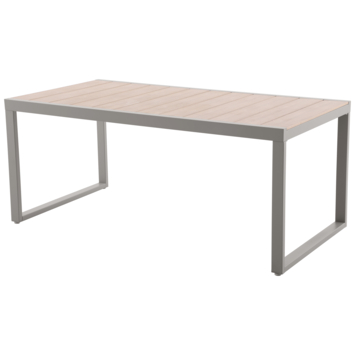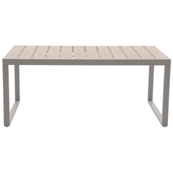 De tuintafel Tulum voor 6 personen combineert taupekleurige metalen poten met een robuust polywood blad en geeft je terras een nette en comfortabele zithoek.