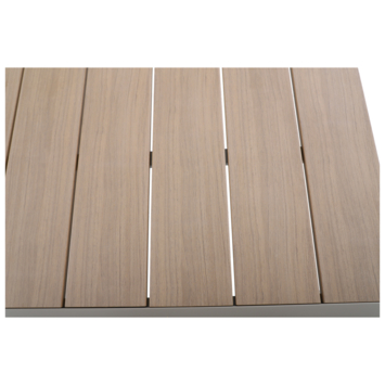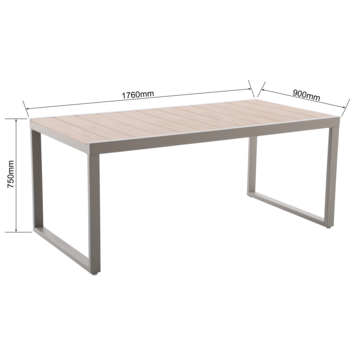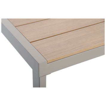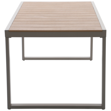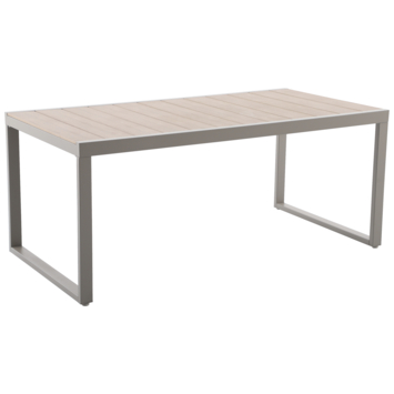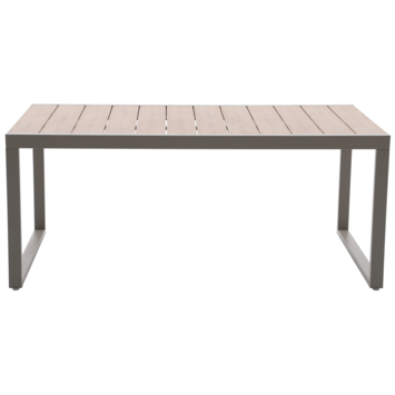 De tuintafel Tulum voor 6 personen combineert taupekleurige metalen poten met een robuust polywood blad en geeft je terras een nette en comfortabele zithoek.