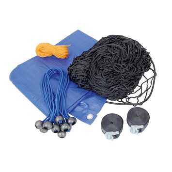 De aanhangerset compleet 160x250cm zorgt ervoor dat jouw lading stevig op jouw aanhanger wordt bevestigd en tevens wordt beschermd. Je vindt in de aanhangerset compleet 160x250cm onder meer een handig aanhangernet van 160cm bij 250cm waarmee je voorkomt dat de lading van de aanhangwagen afwaait. Met de 2 spanbanden van 25mm dik en 5m lang zorg je ervoor dat de lading niet verschuift. Het afdekzeil van 2m bij 3m is ideaal voor een lading die snel wegwaait, zoals z'nd. Voor het vastzetten en zekeren van de lading kan je de 10 bevestigingselastieken van 30cm lang en een doorsnede van 4mm gebruiken, maar ook het touw van 10m lang en 4mm dik. Kortom, de aanhangerset compleet 160x250cm is ideaal voor het beveiligen en beschermen van de lading op jouw aanhangwagen.