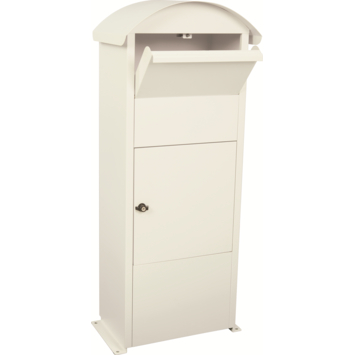 Robuuste, staande brievenbus van gepoedercoat gegalvaniseerd staal. De grote inworpopening (36 x 17 cm) bevindt zich achter de klep. Geschikt voor grotere poststukken en kleine pakketjes. Bij het sluiten van de klep valt de post een verdieping lager in het grote vak dat d.m.v. een cilinderslot afgesloten is.