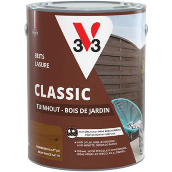 Met de V33 Classic beits tuinhout zijdemat donkerbruin 5 liter bescherm je buitenhout op een eenvoudige manier tegen weer en gebruik. Deze beits is geschikt voor pergola’s, omheiningen, schommels, tuinschermen, hekken en bloembakken. De watergedragen beits maakt het hout waterafstotend en helpt beschermen tegen vocht en uv-stralen.