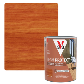 Met de V33 High Protect olie terras en gevel houtolie zijdemat bangkirai 750 ml bescherm je houten oppervlakken buitenshuis tegen weer en gebruik. Deze houtolie is geschikt voor horizontale toepassingen zoals terrasplanken en terrastegels, maar ook voor verticale delen zoals gevelbekleding, schuttingen, schommels en plantenbakken.