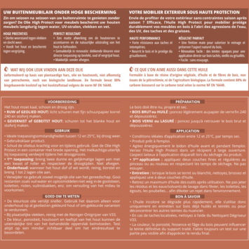 De watergedragen houtolie maakt het hout waterafstotend en helpt beschermen tegen uv-stralen, vlekken en vet. Op terrassen en zones rond zwembaden zorgt de antislip werking voor een beter beloopbaar oppervlak. De zijdematte afwerking behoudt de natuurlijke look van het hout en laat de nerf zichtbaar.
