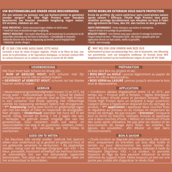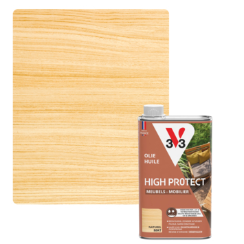 De V33 High Protect olie tuinmeubel houtolie watergedragen mat naturel 500 ml gebruik je om houten tuinmeubelen netjes te behandelen. De olie is geschikt voor tafels, stoelen, banken, ligstoelen en plantenbakken. De watergedragen, hydrofobe formule helpt water af te stoten en biedt bescherming tegen UV en vlekken. De matte afwerking benadrukt de houtnerf en behoudt de natuurlijke look. De bescherming blijft één tot twee jaar zichtbaar, afhankelijk van de omstandigheden.