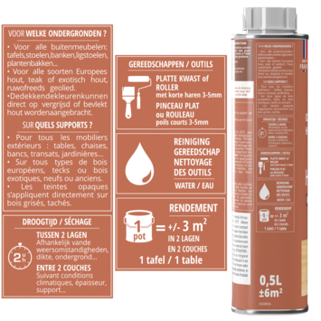 Je brengt de olie gelijkmatig aan met een borstel of rol op proper en droog hout. De kleur naturel ondersteunt de oorspronkelijke houttint. Met 500 ml kun je kleinere meubels of enkele onderdelen van een set behandelen. Zo werk je rustig en met voldoende controle aan een verzorgde afwerking van je tuinmeubilair.