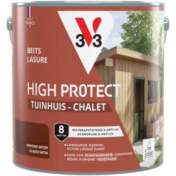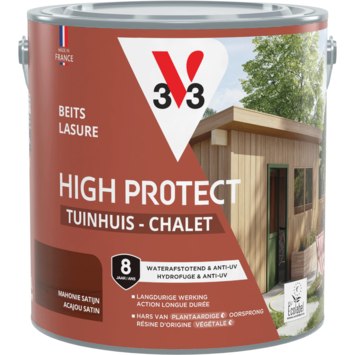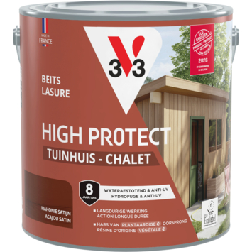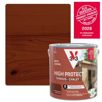 Met de V33 High Protect Tuinhuis beits zijdeglans mahonie 2,5 liter geef je je tuinhuis, berging, luiken, poorten of hekken de bescherming die ze verdienen tegen weer en wind. Deze beits is UV-bestendig en waterafstotend, waardoor zon, regen, sneeuw en vorst minder invloed hebben op het hout. Dankzij de microporeuze formule blijft het hout ademen, terwijl de beits een sterke beschermlaag biedt. De zijdeglansafwerking zorgt voor een warme uitstraling en brengt de natuurlijke houtstructuur mooi naar voren. De anti-druip textuur maakt het aanbrengen eenvoudig en nauwkeurig. Bovendien hecht de beits perfect op oude beitslagen, zelfs op glycero, zonder dat je hoeft te schuren. De watergedragen formule is geurarm en eenvoudig te reinigen. Deze beits is geformuleerd op basis van plantaardige hars, olie en houtvezels, zonder petrochemische of biologisch geteelde grondstoffen. Per liter dek je 12 m², en de beits is stofdroog en overschilderbaar na slechts 3 uur. De aanbevolen verwerkingstemperatuur ligt tussen de 12 en 25°C. De bescherming blijft tot 4 jaar lang behouden.