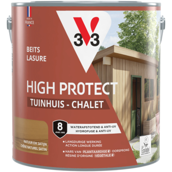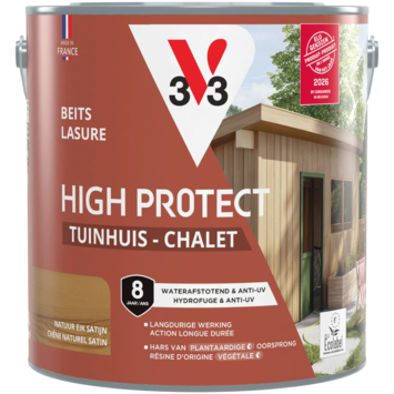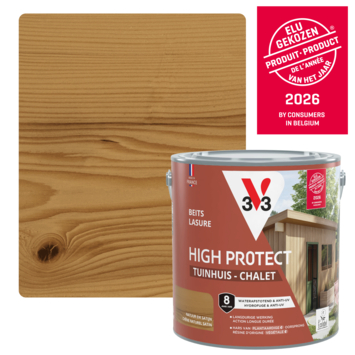 Met de V33 High Protect Tuinhuis beits zijdeglans natuur eik 2,5 liter geef je je tuinhuis, berging, luiken, poorten of hekken de bescherming die ze verdienen tegen weer en wind. Deze beits is UV-bestendig en waterafstotend, waardoor zon, regen, sneeuw en vorst minder invloed hebben op het hout. Dankzij de microporeuze formule blijft het hout ademen, terwijl de beits een sterke beschermlaag biedt. De zijdeglansafwerking zorgt voor een warme uitstraling en brengt de natuurlijke houtstructuur mooi naar voren. De anti-druip textuur maakt het aanbrengen eenvoudig en nauwkeurig. Bovendien hecht de beits perfect op oude beitslagen, zelfs op glycero, zonder dat je hoeft te schuren. De watergedragen formule is geurarm en eenvoudig te reinigen. Deze beits is geformuleerd op basis van plantaardige hars, olie en houtvezels, zonder petrochemische of biologisch geteelde grondstoffen. Per liter dek je 12 m², en de beits is stofdroog en overschilderbaar na slechts 3 uur. De aanbevolen verwerkingstemperatuur ligt tussen de 12 en 25°C. De bescherming blijft tot 4 jaar lang behouden.
