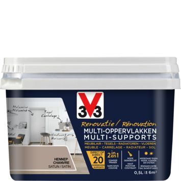 Met de V33 Multi-oppervlak Renovatieverf hennep 500 ml pak je gemakkelijk allerlei klussen in huis aan. Deze renovatieverf is speciaal ontwikkeld voor de renovatie van bijna alle ondergronden. Je gebruikt de verf binnenshuis op meubels, vloeren en tegels en hij hecht direct op niet-zuigende ondergronden en bestaande verflagen. Een primer of afbijt is niet nodig waardoor je snel kunt beginnen.