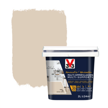 Met de V33 Multi-oppervlak Renovatieverf vlas 2 liter pak je gemakkelijk allerlei klussen in huis aan. Deze renovatieverf is speciaal ontwikkeld voor de renovatie van bijna alle ondergronden. Je gebruikt de verf binnenshuis op meubels, vloeren en tegels en hij hecht direct op niet-zuigende ondergronden en bestaande verflagen. Een primer of afbijt is niet nodig waardoor je snel kunt beginnen.