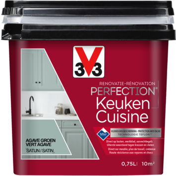 Met de V33 Renovatieverf Perfection Keuken agavegroen 750 ml pak je makkelijk en snel je keuken aan. Deze renovatieverf is geschikt voor veel ondergronden zoals hout, multiplex, gipsplaten, glas, inox, metaal en kunststof. Je hebt geen primer nodig en je hoeft ook niet te schuren of af te bijten voordat je aan de slag gaat. Dankzij de TeflonTM technologie hecht vuil minder snel en blijft je verflaag netjes. De verf kan gebruikt worden op keukenmeubels, aanrechttegels, werkbladen en elektrotoestellen, nieuw of oud.