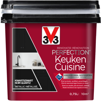 Met de V33 Renovatieverf Perfection Keuken kwartszwart 750 ml pak je makkelijk en snel je keuken aan. Deze renovatieverf is geschikt voor veel ondergronden zoals hout, multiplex, gipsplaten, glas, inox, metaal en kunststof. Je hebt geen primer nodig en je hoeft ook niet te schuren of af te bijten voordat je aan de slag gaat. Dankzij de TeflonTM technologie hecht vuil minder snel en blijft je verflaag netjes. De verf kan gebruikt worden op keukenmeubels, aanrechttegels, werkbladen en elektrotoestellen, nieuw of oud.